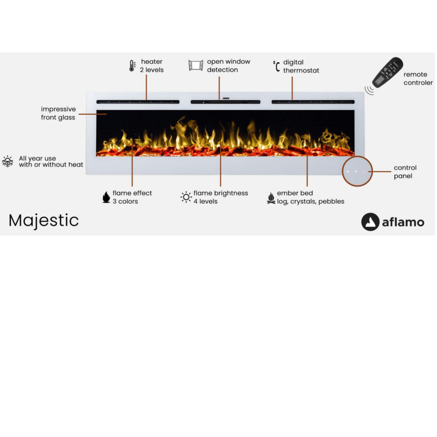 Mit dem Aflamo LED Elektrokamin Majestic bringen Sie ein ganz besonderes Ambiente in Ihre vier Wände. Dank der im Lieferumfang enthaltenen Fernbedienung können Sie das Feuer ganz individuell an Ihre Wünsche anpassen und zB. die Helligkeit und/oder Flammenfarben anpassen.