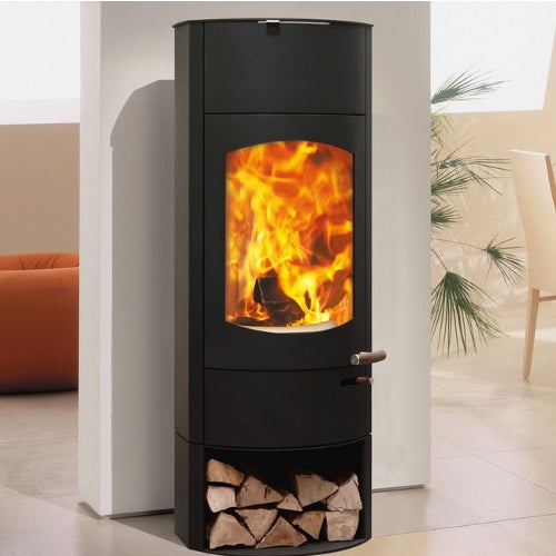 Beheizt wird der Kamin mit gut getrocknetem Scheitholz von maximal 33 cm Länge oder Holzbriketts. Der Ofenkörper ist aus schwarzem Stahl, ausgekleidet ist der Brennraum mit Keramott.
