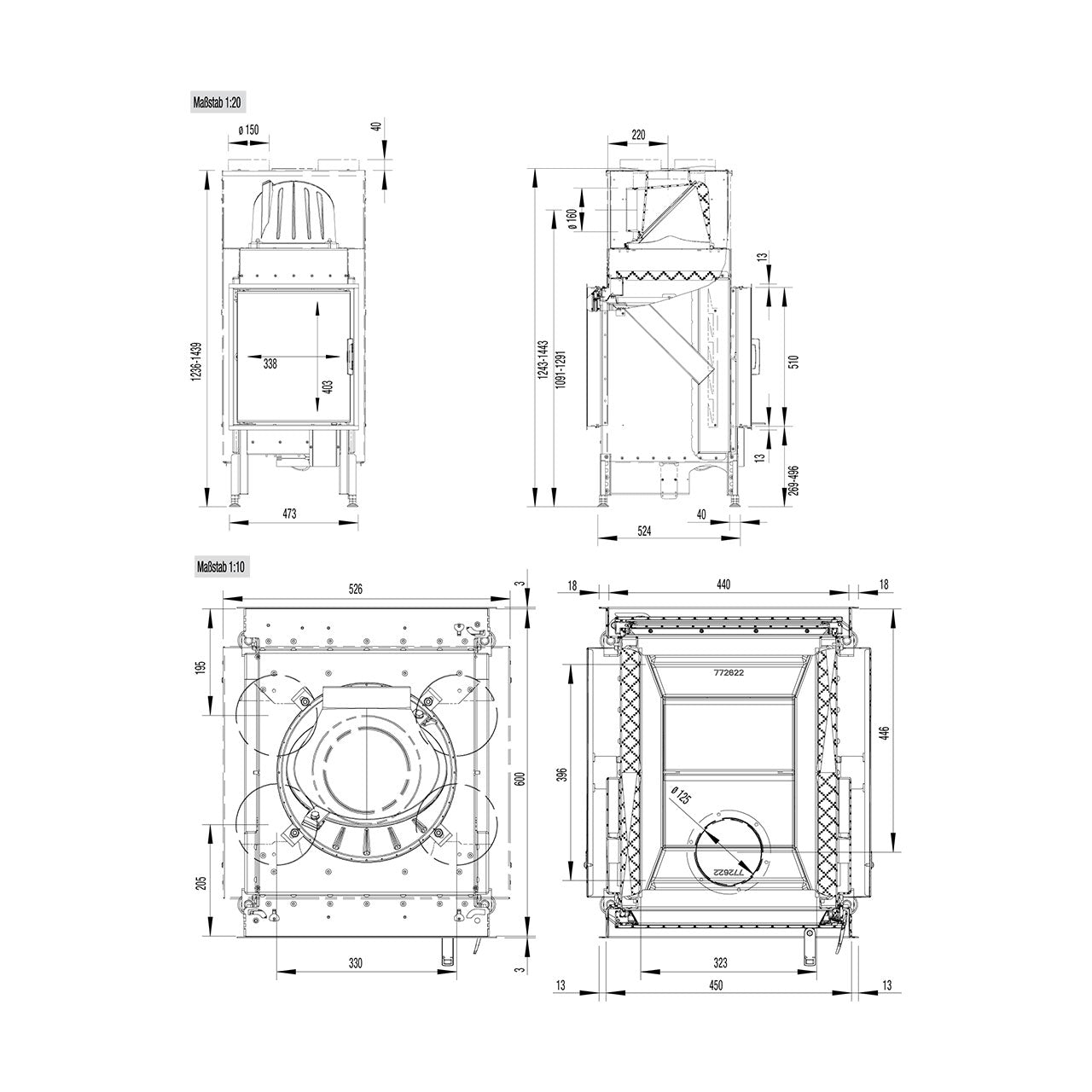 - Rauchrohrstutzen: 160 mm oben/hinten