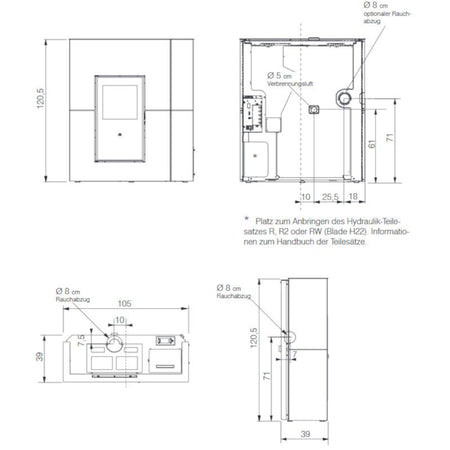 Der Blade H wird mit Pellets befeuert und verbraucht, je nach Leistung, ca. 1-4 kg/Stunde. Wasserseitig werden 16 kW abgegeben - als Unterstützung für Ihr Zentrales Heizungssystem. Somit profitiert Ihr ganzes Haus von diesem einzigartigen Pelletofen.
