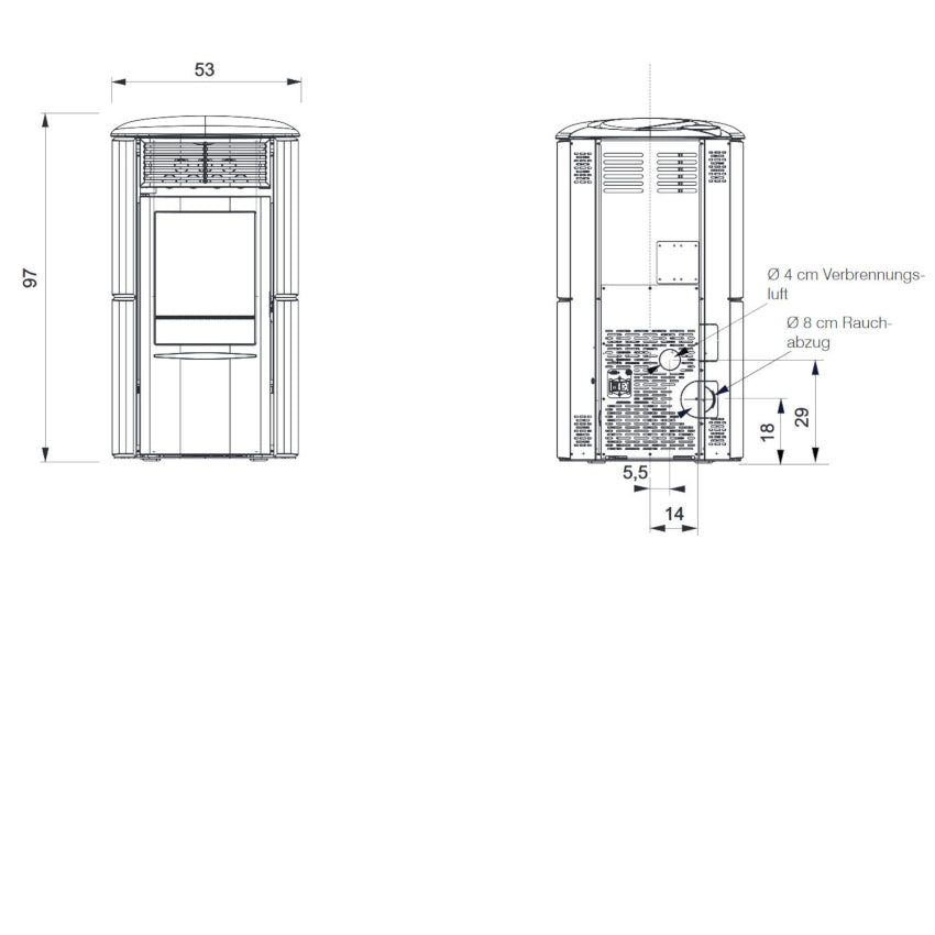 Der Aris Up2 hat eine Nennwärmeleistung von 8,2 kW und schafft es somit Räume bis zu 215 m³ (Herstellerangabe) zu beheizen. Der Pellettank fasst 15 kg Pellets und kann somit ca. 8 Stunden den Pelletofen mit Brennstoff versorgen.