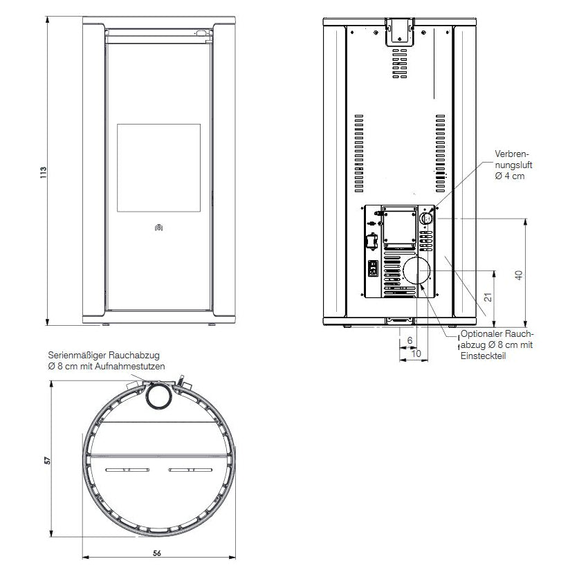 Der Evia2 ist ein edler Pelletofen der Firma Edilkamin. Die Vorderseite besteht aus schwarzem Glas, die Seitenteile aus Stahl. Die runde Form des Evia2 schmiegt sich ideal in Ihren Aufstellraum ein. Die Rauchauslässe dieses Pelletofen sind standardmässig oben-sollten Sie den Pelletofen lieber an der Rückseite anschließen, dann benötigen Sie das optionale Kit für Rauchauslässe hinten.