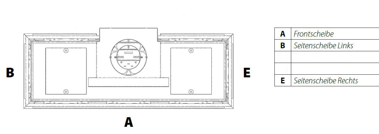 • Front A, Seite B, Seite E und hintere Scheibe C