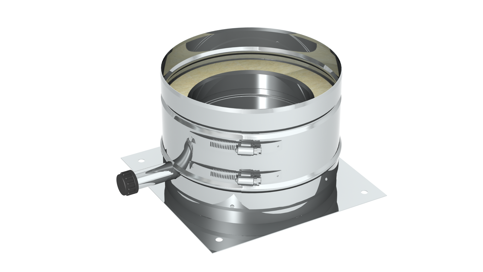 Die Grundplatte für Sockelmontage eignet sich zur Bodenmontage des Edelstahlschornsteinsystems. Das Bauteil lässt sich mit jedem anderen Element des selben Durchmessers und Systems kombinieren. Der Kondensatablauf erfolgt seitlich.