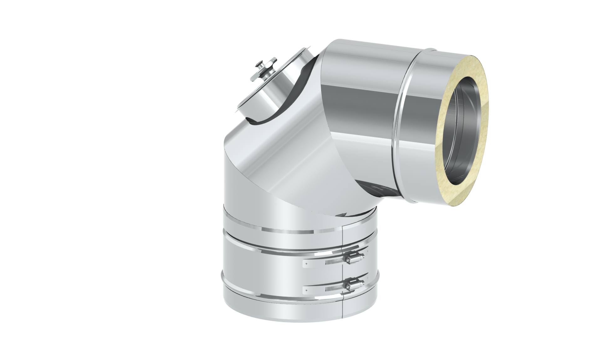 Der doppelwandige Edelstahlbogen mit einem Winkel von 90° kann mit allen anderen Teilen desselben Durchmessers kombiniert werden und schafft so die Möglichkeit das System um 90° abzuführen.