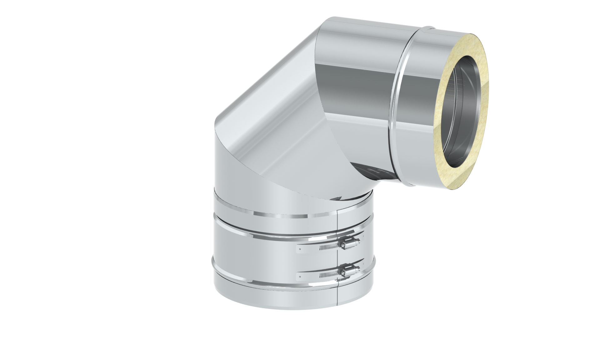 Der doppelwandige Edelstahlbogen mit einem Winkel von 90° kann mit allen anderen Teilen desselben Durchmessers kombiniert werden und schafft so die Möglichkeit das System um 90° abzuführen.