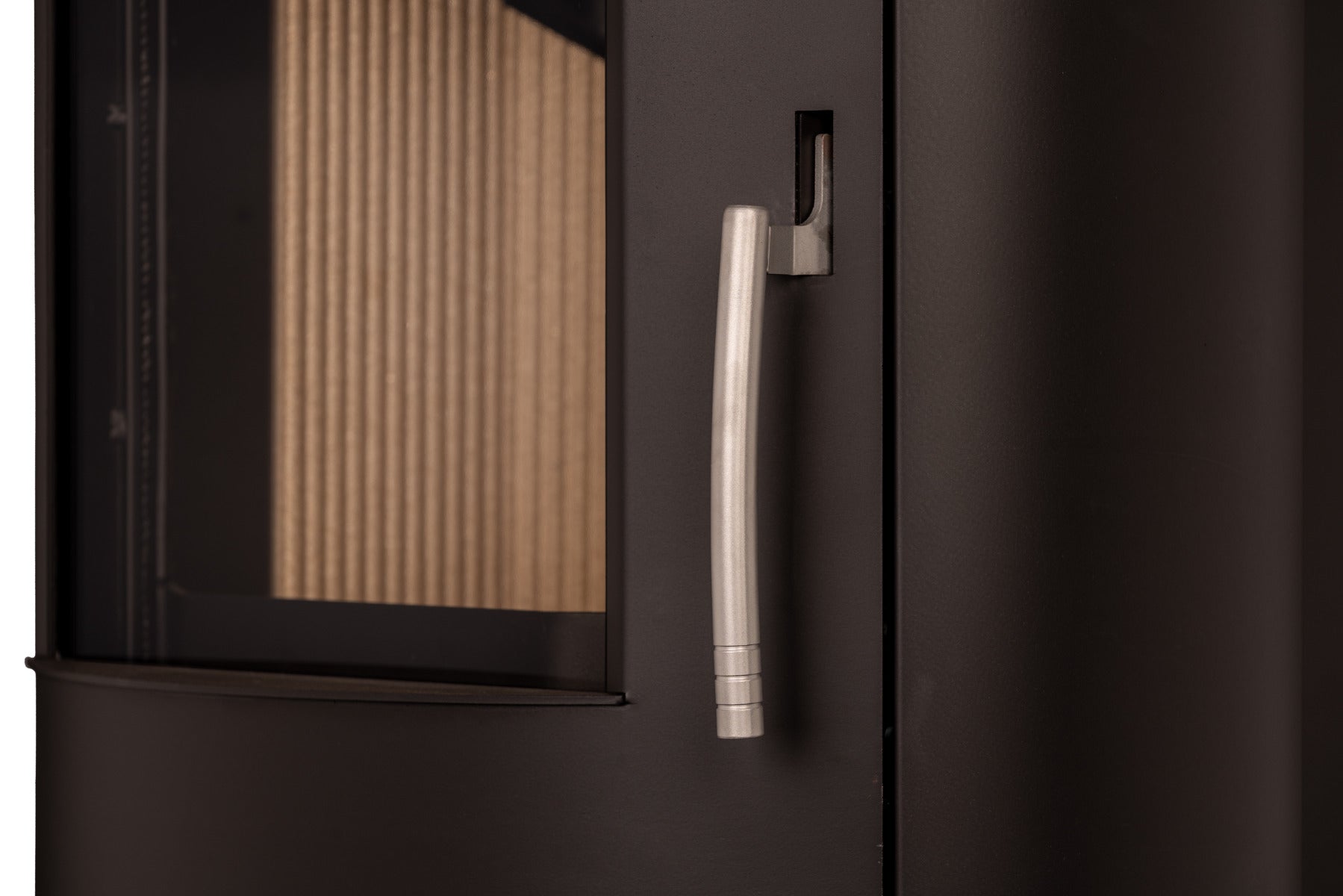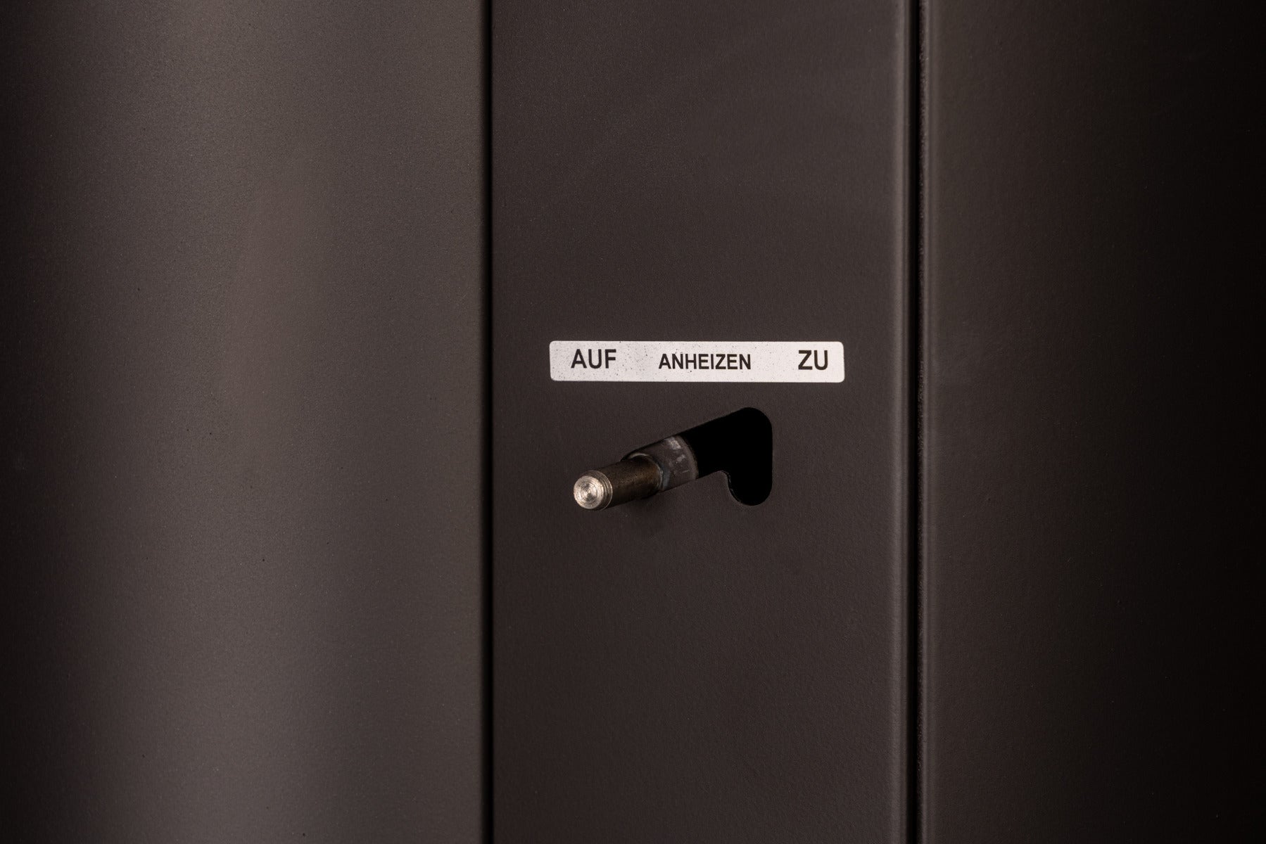 Beim Schließen der Feuerraumtür schnappt ein Verschlussriegel mittels Federkraft zu und hält die Tür sicher verschlossen, bis sie wieder durch Ziehen am XXL-Griff geöffnet wird.