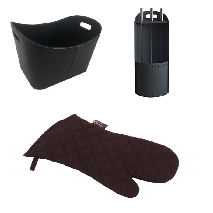 Feuerfeste Eleganz im stilvollen Set| Kaminholzkorb, Kaminbesteck und Kaminhandschuh