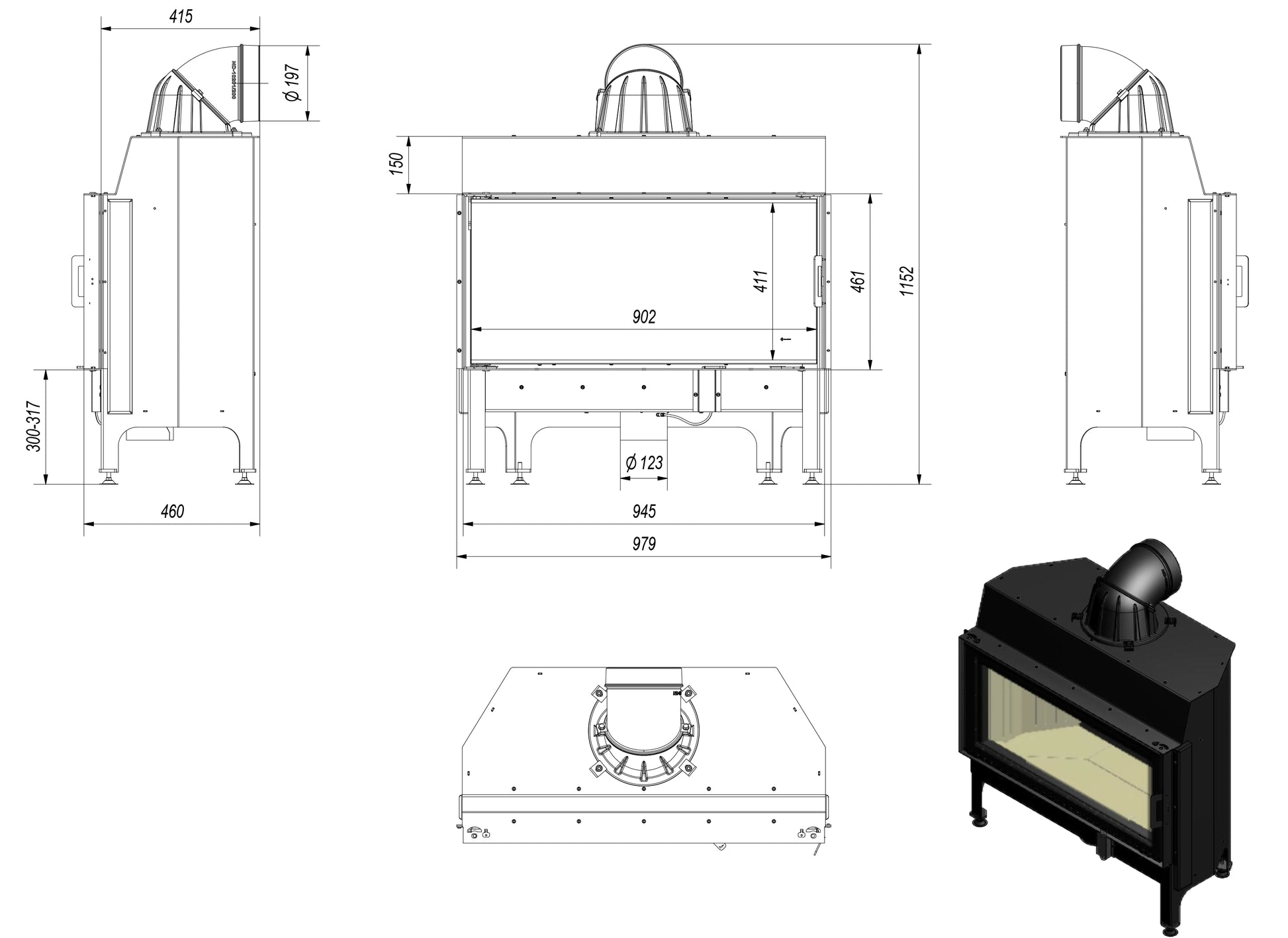 - regulierbare Füße erleichtern das richtige Aufstellen des Kamineinsatzes