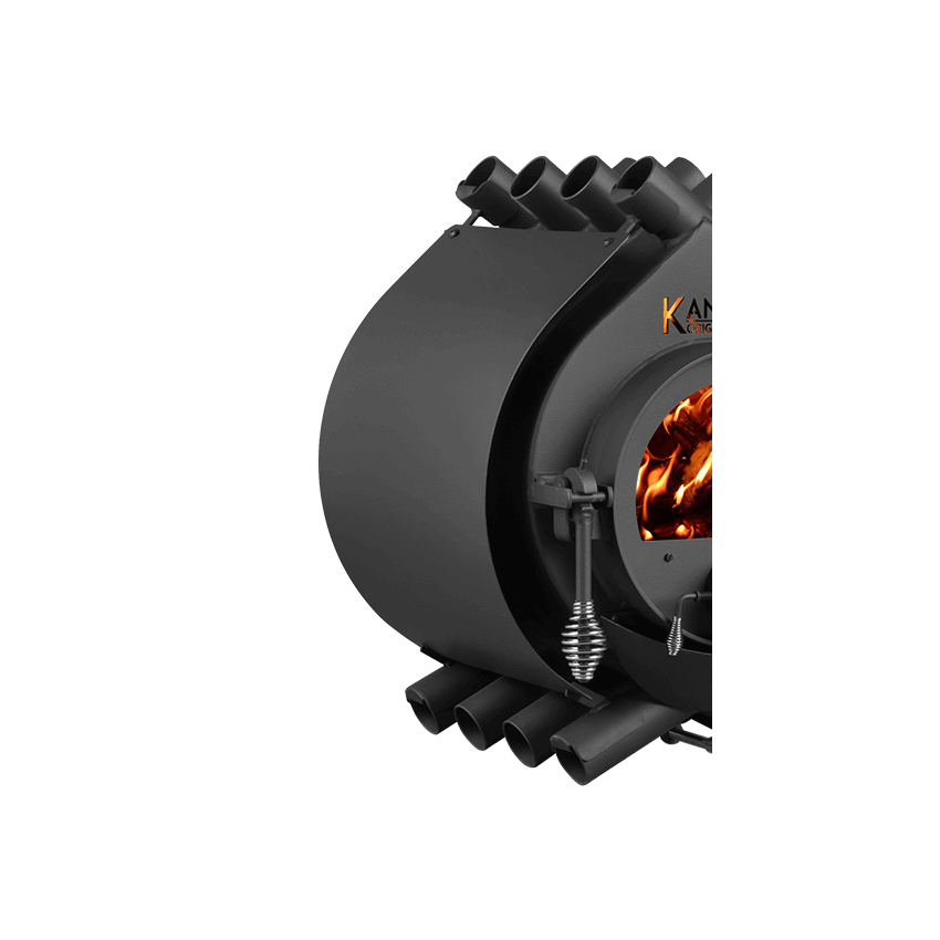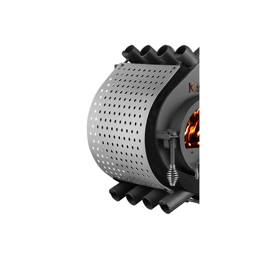 Durch die wie Rippen anliegenden Röhren wird die Raumluft von unten angesaugt und an der Brennkammer vorbeigeführt. Die dadurch erwärmte Luft wird nun gleichmäßig in verschiedene Richtungen in den Raum geblasen. Diese Technologie ist auch ein Grund für den makellosen Wirkungsgrad von 83 %. Das Konvektionsprinzip lässt sich durch Seitenbleche noch verstärken. Dafür finden Sie in der Zubehörauswahl verschiedene Designs.