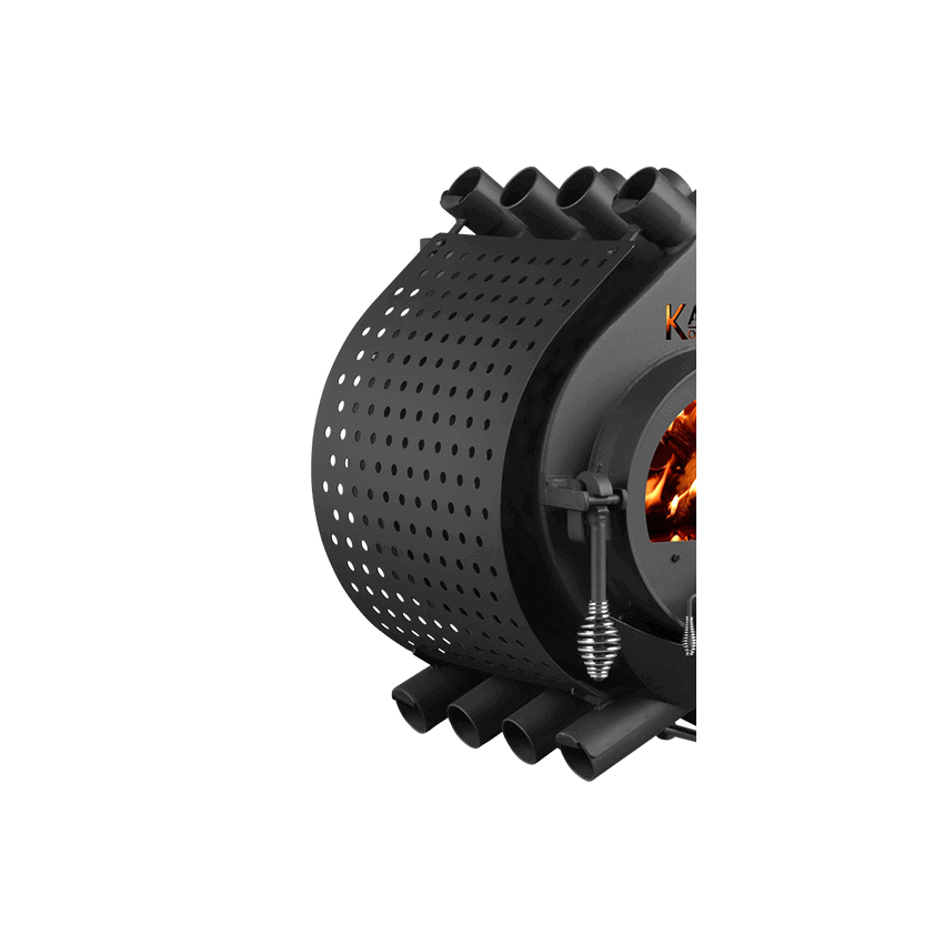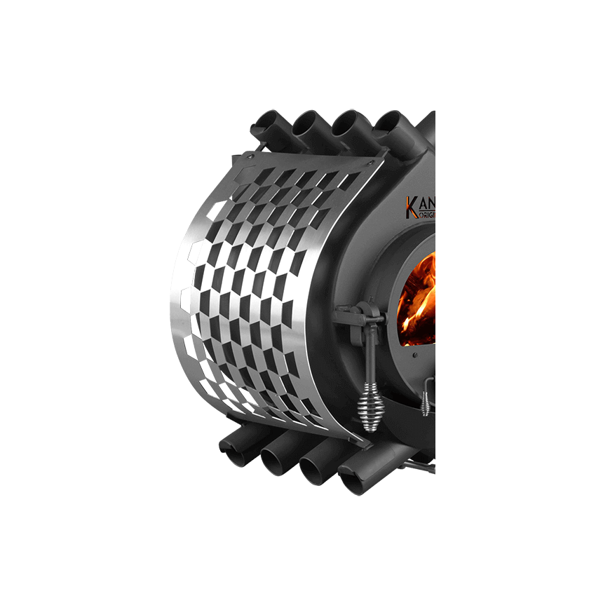 Durch die wie Rippen anliegenden Röhren wird die Raumluft von unten angesaugt und an der Brennkammer vorbeigeführt. Die dadurch erwärmte Luft wird nun gleichmäßig in verschiedene Richtungen in den Raum geblasen. Diese Technologie ist auch ein Grund für den makellosen Wirkungsgrad von 84,5 %. Das Konvektionsprinzip lässt sich durch Seitenbleche noch verstärken. Dafür finden Sie in der Zubehörauswahl verschieden Designs.