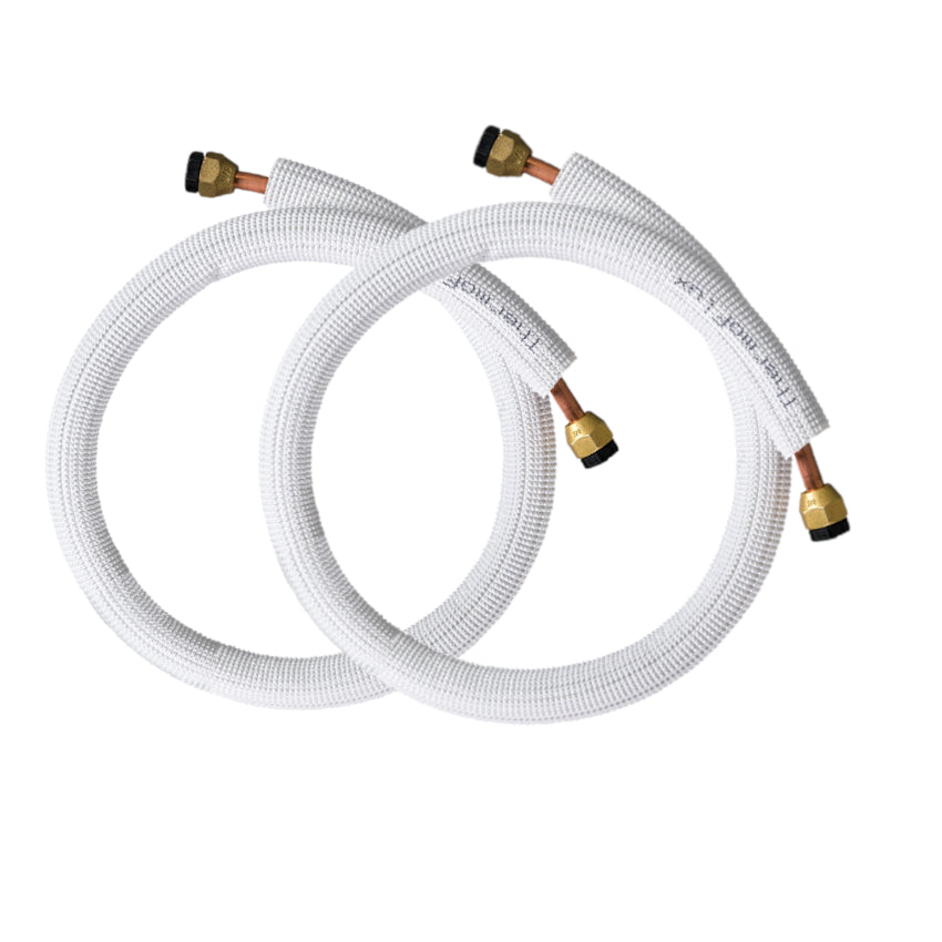 Zur optimalen Verbindung zwischen Innen- und Außeneinheit beinhaltet das Set zwei hochwertige, isolierte Kältemittelleitungen auf 5-Meter-Rollen. Die 1/2'' und 1/4'' Doppelrohre sind sorgfältig vorisoliert, um den Energieaustausch zu minimieren und die Effizienz Ihres Systems zu maximieren. Diese Leitungen sind nicht nur für ihre Langlebigkeit bekannt, sondern auch für ihre Fähigkeit, die Leistung Ihrer Klimaanlage zu verbessern.