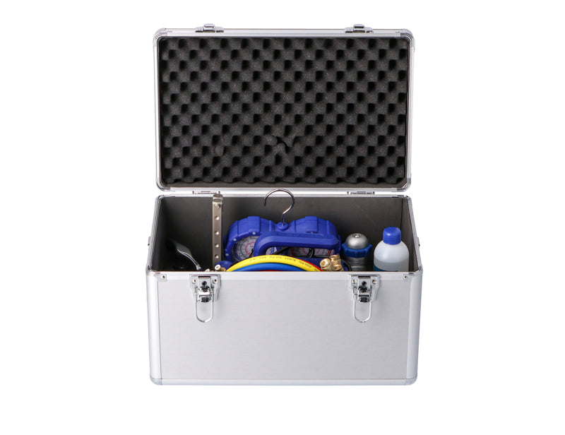 Dieses Klimaworld Koffer-Set bietet alles, was Sie Befüllung von Kältemittel in Klimaanlagen benötigen. Der designschöne Koffer ist mit praktischem Tragegriff und besteht aus Aluminium. Für R32, R410A, R407C und R134A geeignet.