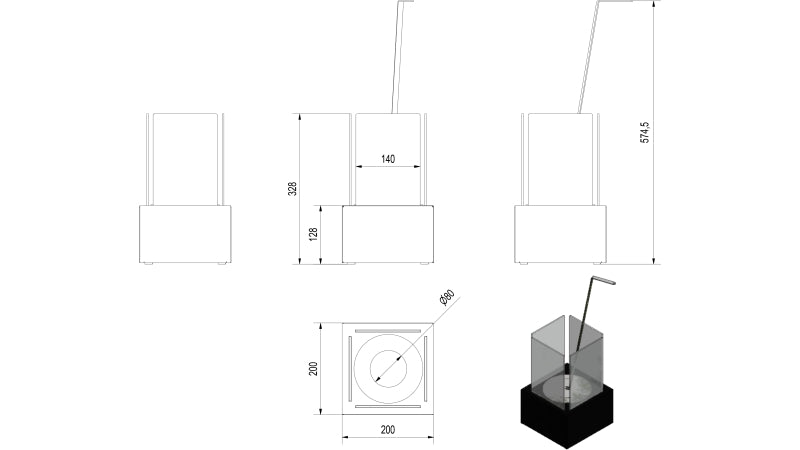 - Abmaße Biokamin Höhe x Breite x Tiefe: 328 x 200 x 200 mm