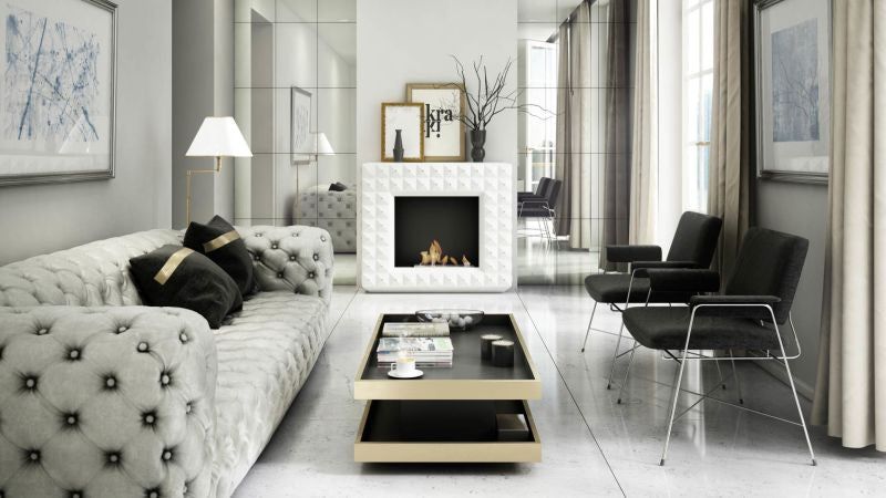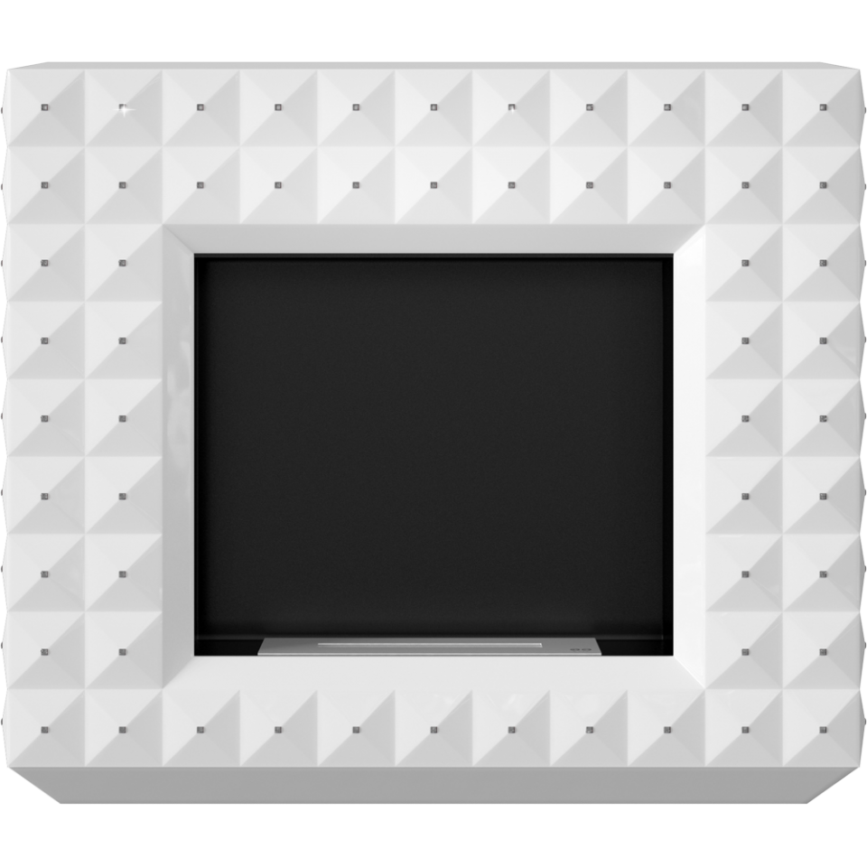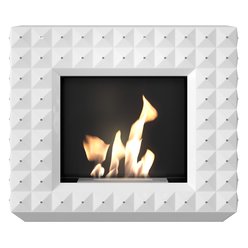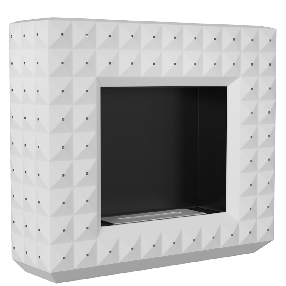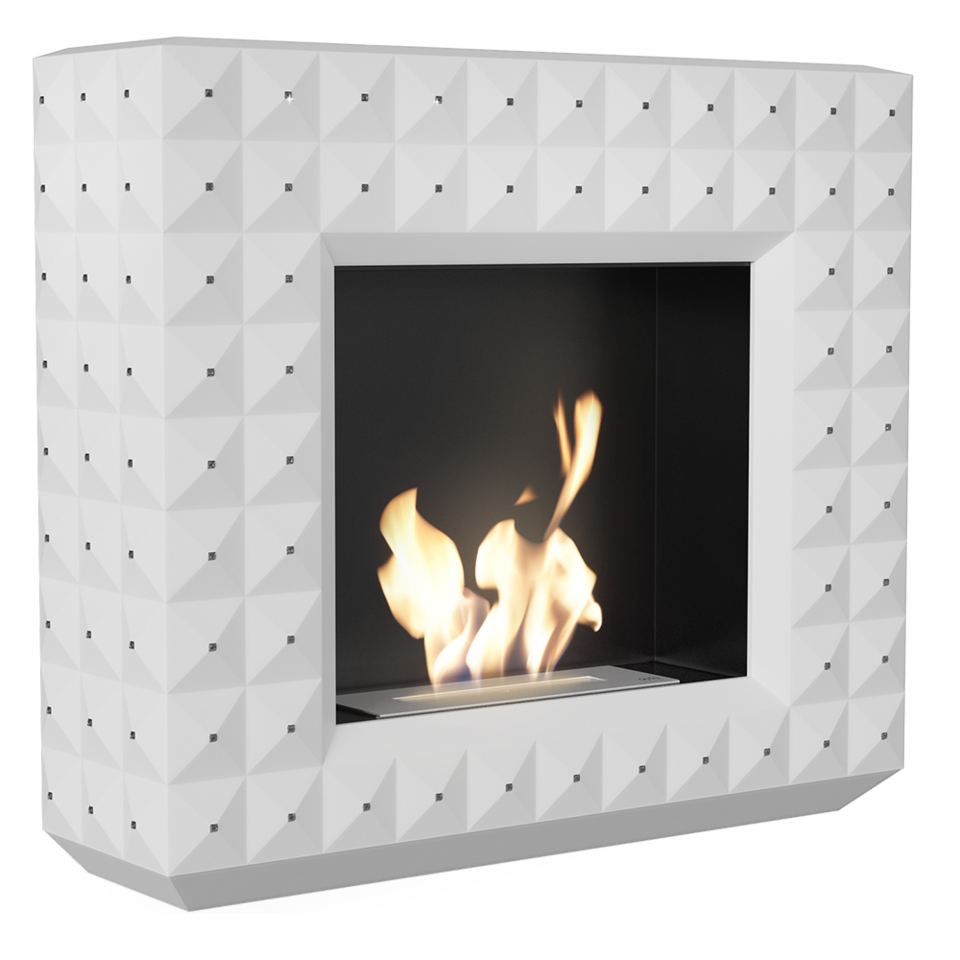 Ethanol Kamin Bio / Standkamin Egzul im pyramidenförmigen Design inkl. MDF-Wandverkleidung weiß matt mit edlen Swarovski-Kristallen | TÜV geprüft | EGZUL/SV/TUV