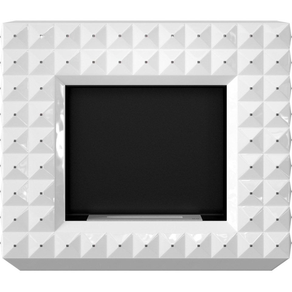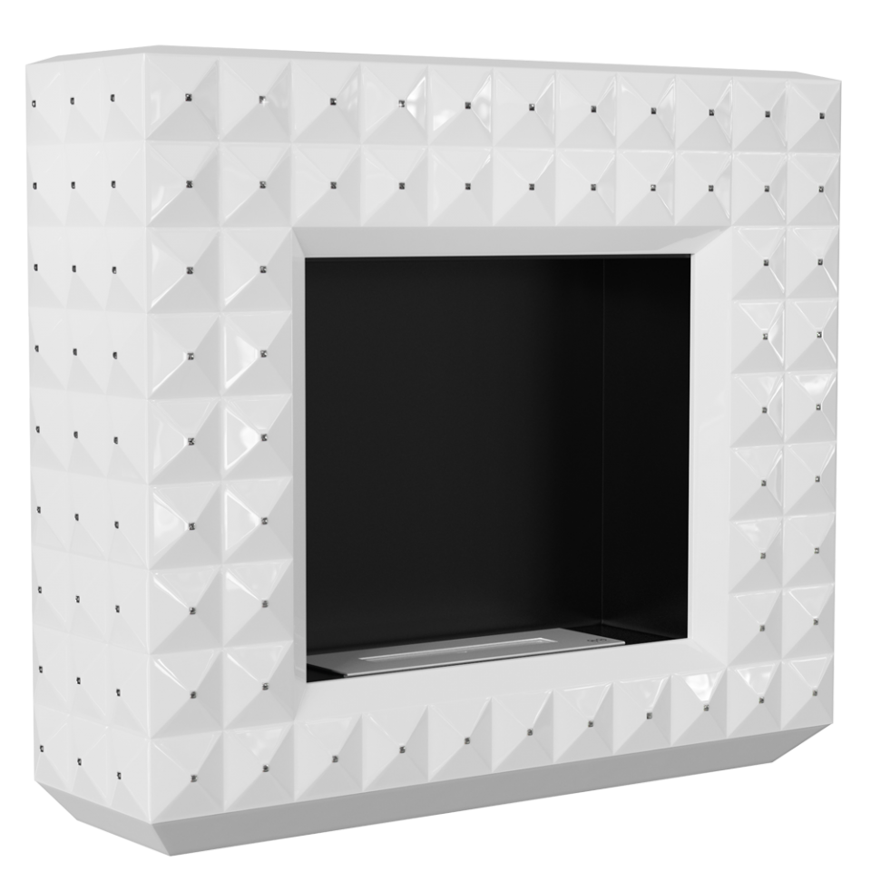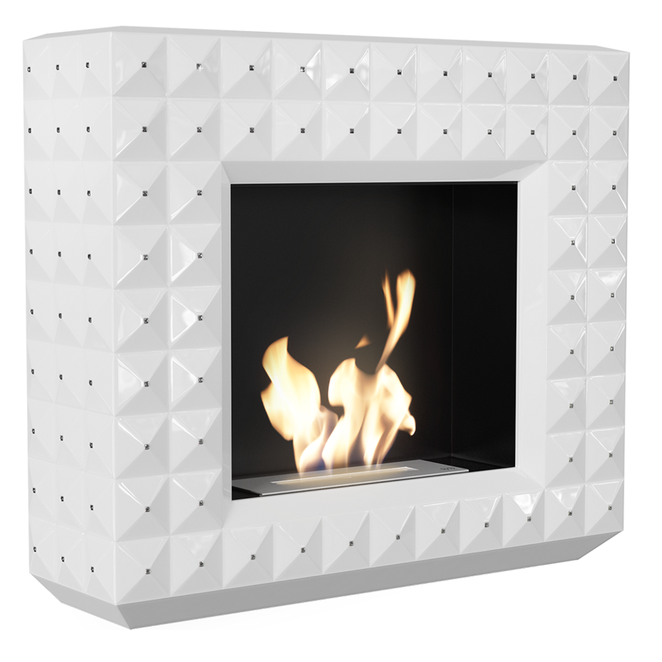 Ethanol Kamin Bio / Standkamin Egzul im pyramidenförmigen Design inkl. MDF-Wandverkleidung weiß glänzend mit edlen Swarovski-Kristallen | TÜV geprüft | EGZUL/SV/POLYSK/TUV