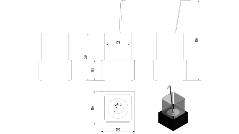 - Abmaße Biokamin Höhe x Breite x Tiefe: 353 x 250 x 250 mm