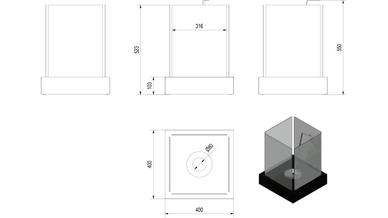 - Abmaße Biokamin Höhe x Breite x Tiefe: 523 x 400 x 400 mm