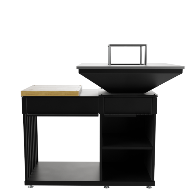 Das speziell verlängerte Untergestell des QUADRUM/BBQ/H bietet ein größeres Holzfach und die dazugewonnene Seitenablage mit Holztischplatte kann als adäquate Arbeitsfläche z. B. zum Schneiden dienen.