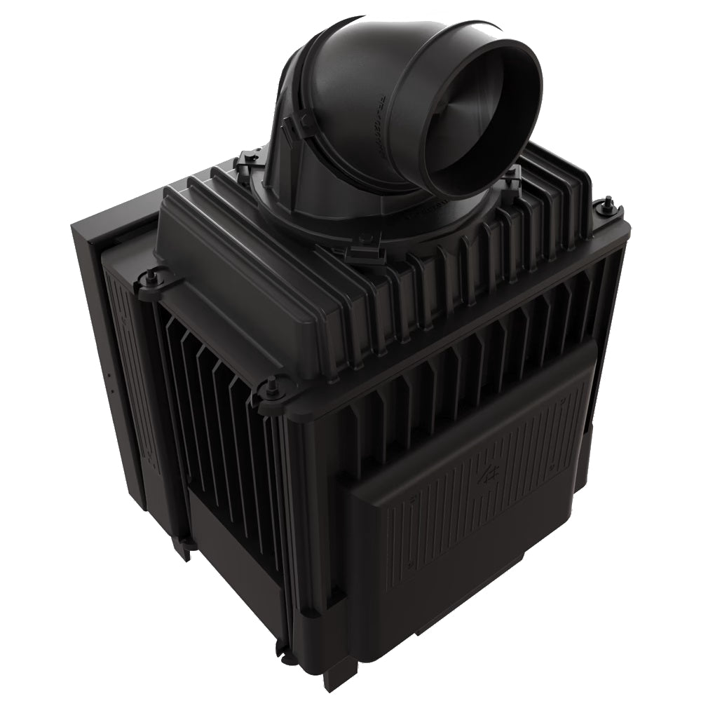 Mit einem standardmäßig eingebauten Lufteinlass von 125 mm gewährleistet der Einsatz eine zuverlässige Luftzufuhr von außen, was eine effiziente Verbrennung ermöglicht. Das dreifache Zulüftungssystem der Verbrennungskammer ist ein wahres Highlight dieses Kamineinsatzes: