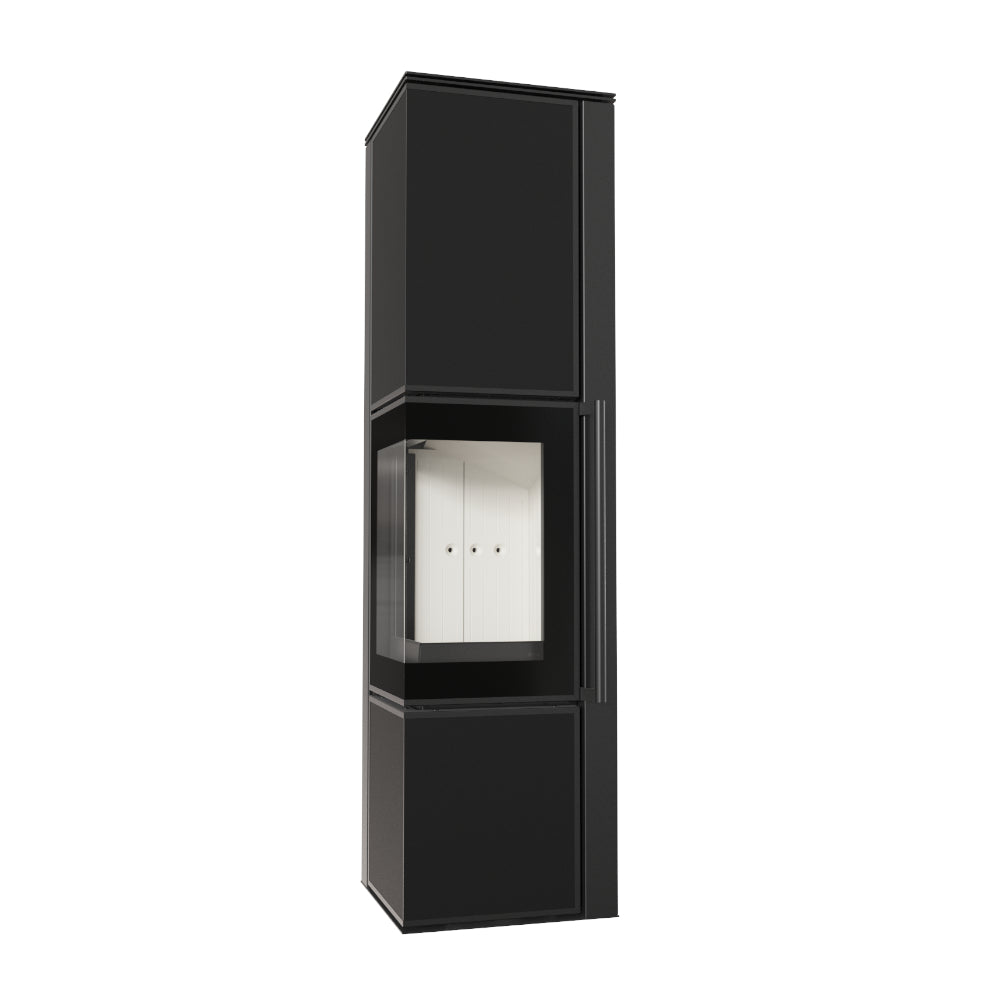Der Kaminofen TORA besticht durch seine hochwertige Verkleidung aus Quarzsinter in der edlen Farbe Nero Assoluto, die den modernen Stil des Ofens unterstreicht. Dieses Material verbindet Funktionalität mit ansprechender Optik: Es ist extrem hitzebeständig, kratzfest und leicht zu reinigen. Die Quarzsinterplatte verleiht dem Ofen eine elegante, langlebige Oberfläche, die robust und pflegeleicht ist. Die doppelseitige Verglasung und die schwarz verglaste Ecktür ermöglichen einen beeindruckenden Blick auf die Flammen aus verschiedenen Perspektiven.