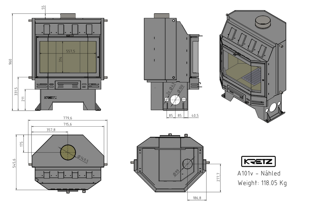 Dank des Warmwasser-Kamineinsatzes A 101 V vom tschechischem Hersteller Kretz können Sie sich ganz einfach die Wohlfühlwärme ins Haus holen, ohne auf bestimmte Designs achten zu müssen. Er ist dafür gemacht, sich ganz nach Ihren Wünschen individuell in Ihrem Wohnraum anzupassen. Der qualitativ hochwertige Kamineinsatz wurde entworfen, um Wasser durch eine automatische Verbrennung von Holz im Brennraum zu erhitzen. Das Wasser im Heizkamin wird erwärmt und an die Heizanlage geschickt. Der A 101 V ist ein moderner Breitbild-Kamineinsatz mit hoher Effizienz und umweltfreundlicher Verbrennung. Der fachmännisch abgedichtete Feuerraum aus feuerfestem Schamotte garantiert eine perfekte Verbrennung.