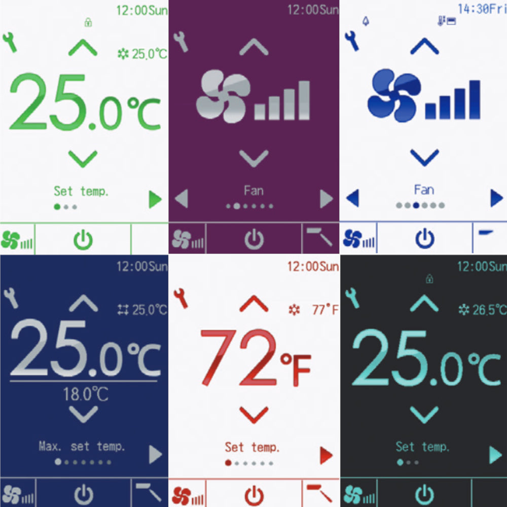 Die elegante und vielseitige Kabelfernbedienung ist ein technisches Multitalent. Mit ihrem mehrfarbigen Touchdisplay verfügt sie über eine große Flexibilität in puncto Farbgestaltung und Handhabung. Sie bietet sämtliche Funktionen für die lokale Bedienung eines einzelnen Klimagerätes oder einer Gruppe von bis zu 16 Innengeräten. Über das übersichtliche, mehrfarbige LCD-Display inklusive Hintergrundbeleuchtung und Status-LED lassen sich alle Geräte der City-Multi-, Mr. Slim- und M-Serie bequem steuern.