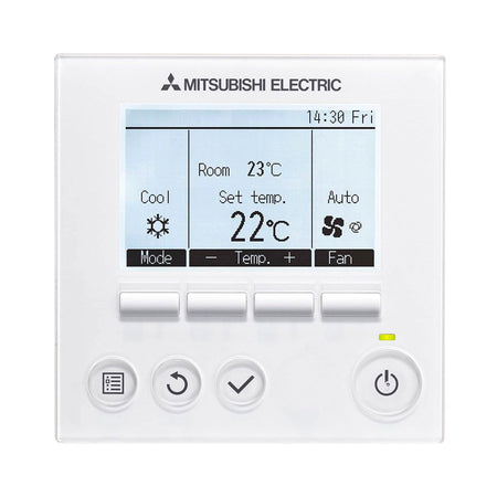 Die Kabelfernbedienung bietet sämtliche Bedienfunktionen für die lokale Bedienung eines Klimagerätes oder einer Gruppe von bis zu 16 Innengeräten. Alle Geräte der City-Multi-, Mr. Slim- und M-Serie lassen sich so bequem und einfach steuern. Zudem besteht die Möglichkeit, einzelne Klimageräte oder Gerätegruppen mit einem Frischluftsystem (z. B. Lossnay) zu koppeln. Für das Frischluftsystem können Lüfterstufen und Stopp gewählt werden. Beim Einschalten des jeweiligen Innengerätes wird das gekoppelte Frischluftsystem mit eingeschaltet und somit eine optimale Luftqualität erreicht.