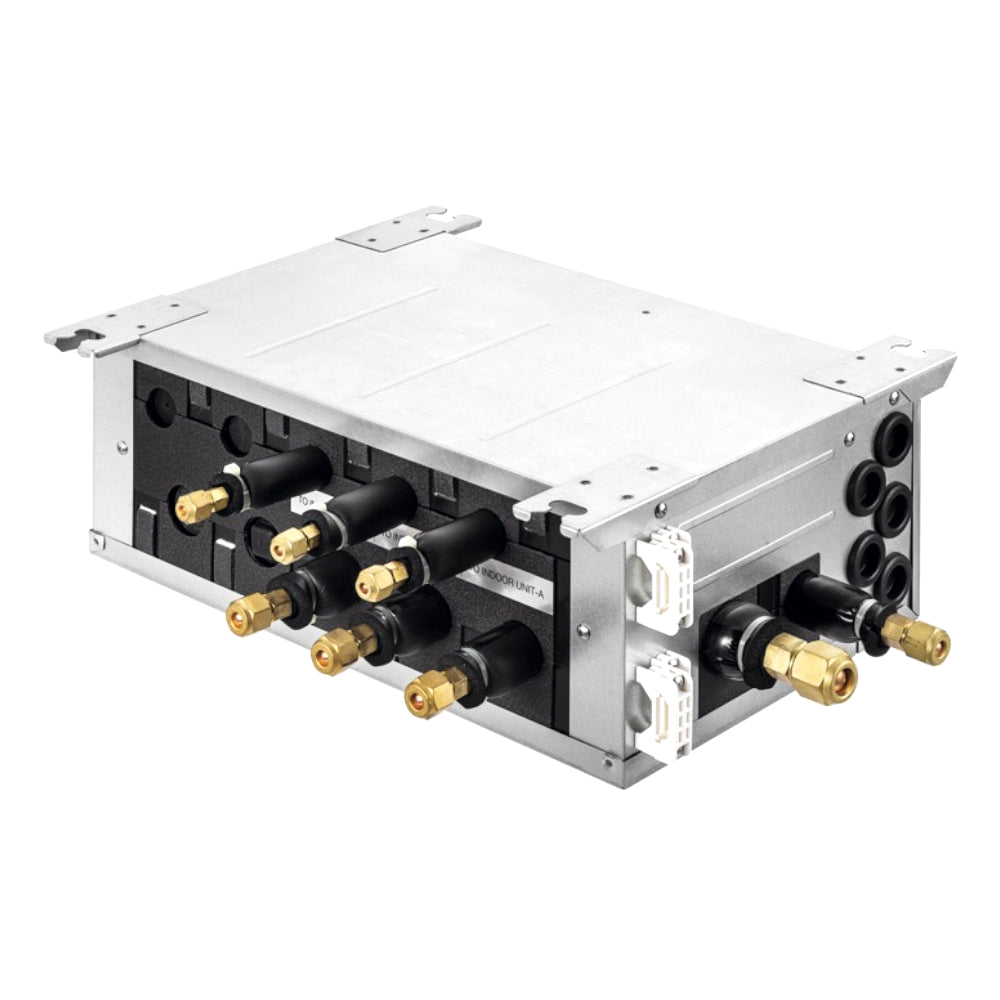 Die Anschlussbox ermöglicht die einfache Einbindung von mehreren Innengeräten der M-Serie und Mr. Slim-Serie in ein City Multi VRF-System. Der Vorteil für den Anwender besteht in einer deutlich vergrößerten Auswahl an möglichen Innengeräten. Neben dem elektronischen Expansionsventil enthält das Anschluss-Kit eine Steuerplatine und ein Adressboard für die genaue Adressierung jedes eingesetzten Innengerätes. Die Montage des Kits kann am Innengerät selbst oder in bis zu 15 m Entfernung, z. B. außerhalb des zu klimatisierenden Raumes in einer Zwischendecke, erfolgen. Die Box benötigt eine Spannungsversorgung (230 V, 50 Hz, 1 Phase) und versorgt auch die angeschlossenen Innengeräte mit Spannung. Das Gehäuse ist dampfdiffusionsdicht isoliert und benötigt keinen Kondensatablauf. Zur Verbindung zweier Anschlussboxen kann ein handelsübliches T-Stück verwendet werden.