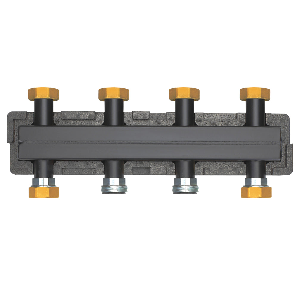 Standardverteilerbalken mit EPP-Isolierung und je 2 Anschlusspaaren oben und unten zum Aufbau der Pumpengruppen UK und MK. Diese Ausführung für bis zu 2 Heizkreise ist komplett mit den notwendigen Verschraubungs- und Anschluss teilen ausgestattet.
