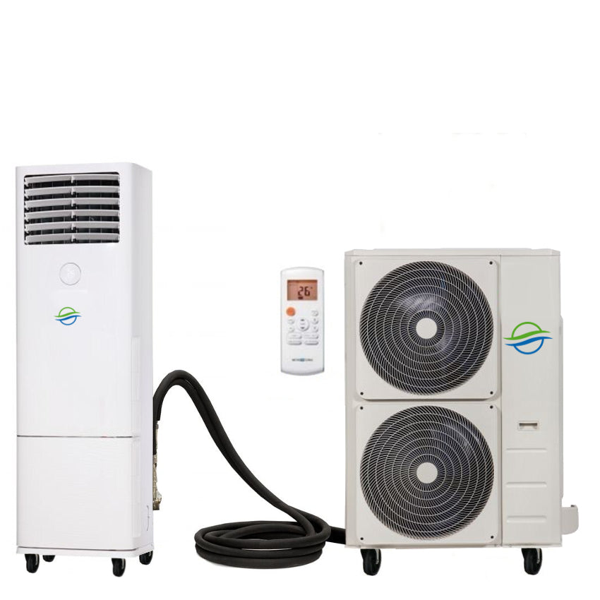 Diese Mobile Inverter-Klimaanlage besteht aus einem Säulenklimainnengerät und einem Außengerät. Beide Teile sind durch ein hochflexibles Edelstahl-Flexrohr verbunden. Durch diese flexible Leitung ist ein ständig wechselnder Aufstellort sowie Neubiegung der Leitung kein Problem. Durch die Rollenaufständerung unter dem Innen- und Außengerät ist die komplette Anlage mobil, dies erleichtert ebenfalls den Standortwechsel.