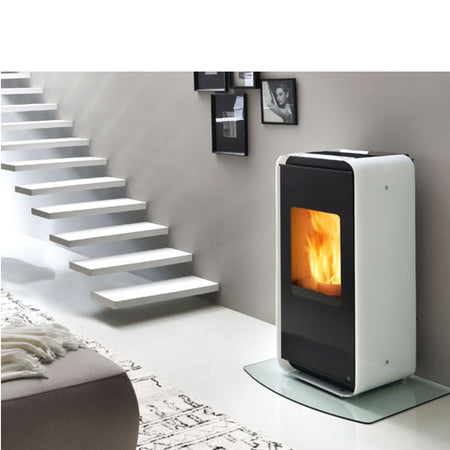 Der Pelletofen Nea 8kw ist für die modernen Passivhaüsern geeignet, gekennzeichnet durch ein modernen Design mit weiche Linien, erhältlich mit Verkleidung aus weißen oder schwarzen Glas.