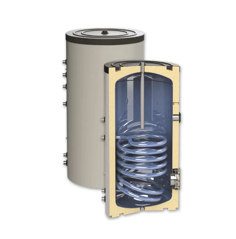 Der Speicher ist mit einem Wärmetauscher ausgestattet und ermöglicht die Nutzung erneuerbarer Energien wie Solarsysteme oder Heizkessel. Bei Bedarf kann eine elektrische Heizquelle als Sonderausrüstung hinzugefügt werden. Des Weiteren sind am Speicher Außengewinde-Anschlüsse für Kaltwasser, Heißwasser, den Wärmetauscher und die Rückführung vorhanden. Die Anschlüsse sind in einem 180-Grad-Winkel angeordnet, um eine praktische und gut zugängliche Installation zu gewährleisten.