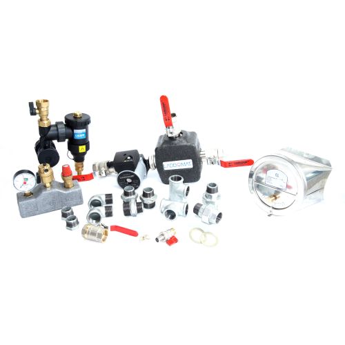Das Set beinhaltet zudem Kugelhähne, Doppelnippel, Verschraubungen, Dichtungen, Winkel, Reduktionsnippel und T-Stücke, die eine flexible und einfache Montage ermöglichen. Der mitgelieferte Zugbegrenzer sorgt für einen ausgeglichenen Unterdruck im Schornstein und verhindert damit Leistungsverluste durch äußere Einflüsse.