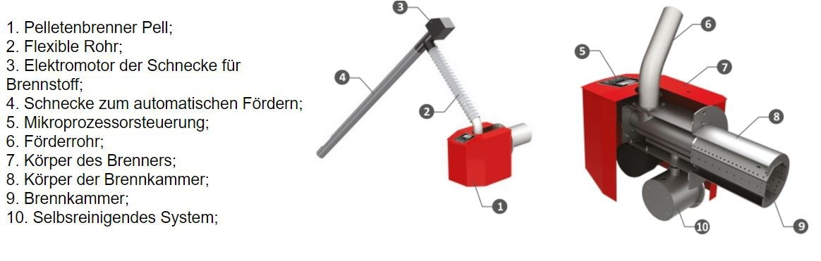 Der montierte Pelletbrenner ist aus hochwertigem rostfreiem Stahl hergestellt und hält Temperaturen bis 1150° C aus. Der Brenner ist an der unteren Tür des Heizkessels montiert. Mikroprozessorsteuerung, Selbstreinigungssystem und Förderschnecke garantieren das automatisierte Funktionieren des Brenners und das optimale Verbrennen des Brennstoffs.