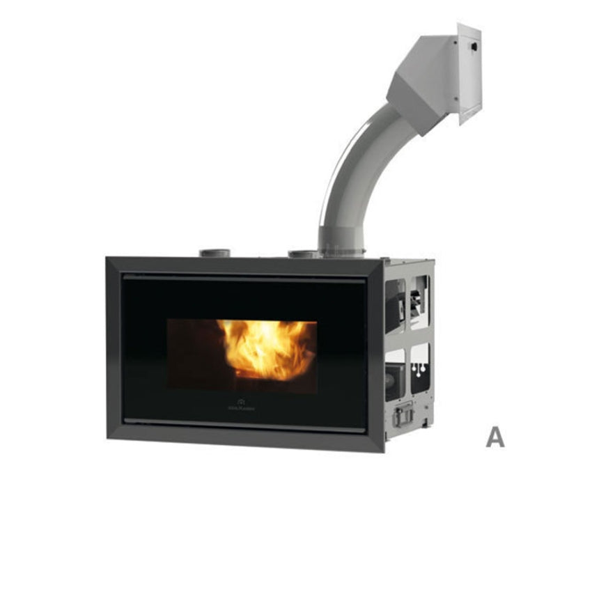 • Variante A: Pellet-Einfüllrutsche, 2 LABEL Luftdurchlässe, Ventilator-Teilesatz und Rahmen, Warmluftkanalisierung
