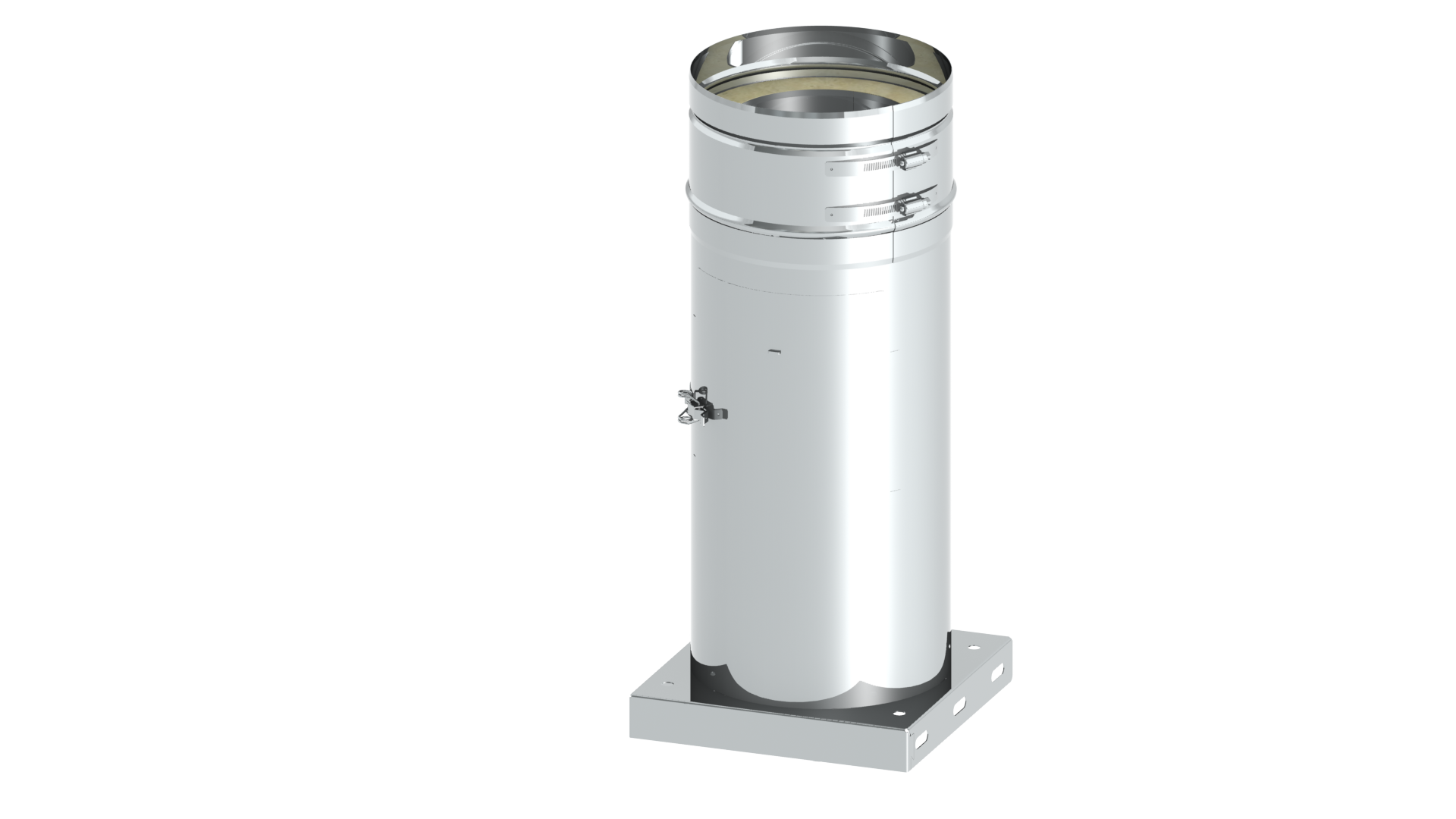 Reinigungselement mit integrierter Grundplatte und Kondensatablauf unten für Festbrennstoffe (Außenbereich). Das Bauteil lässt sich mit jedem anderen Element des selben Durchmessers und Systems kombinieren. Geeignet ist diese Reinigungstür zur direkten Implementierung in das Schornsteinsystem und ermöglicht somit das Reinigen der Anlage.
