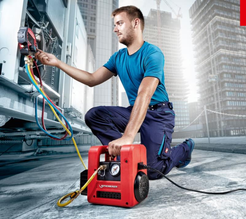 Evakuieren, Absaugen und Wiegen mit der Vakuumpumpe ROAIRVAC R32 3.0 von Rothenberger für Klimaanlagen bis 74 kW