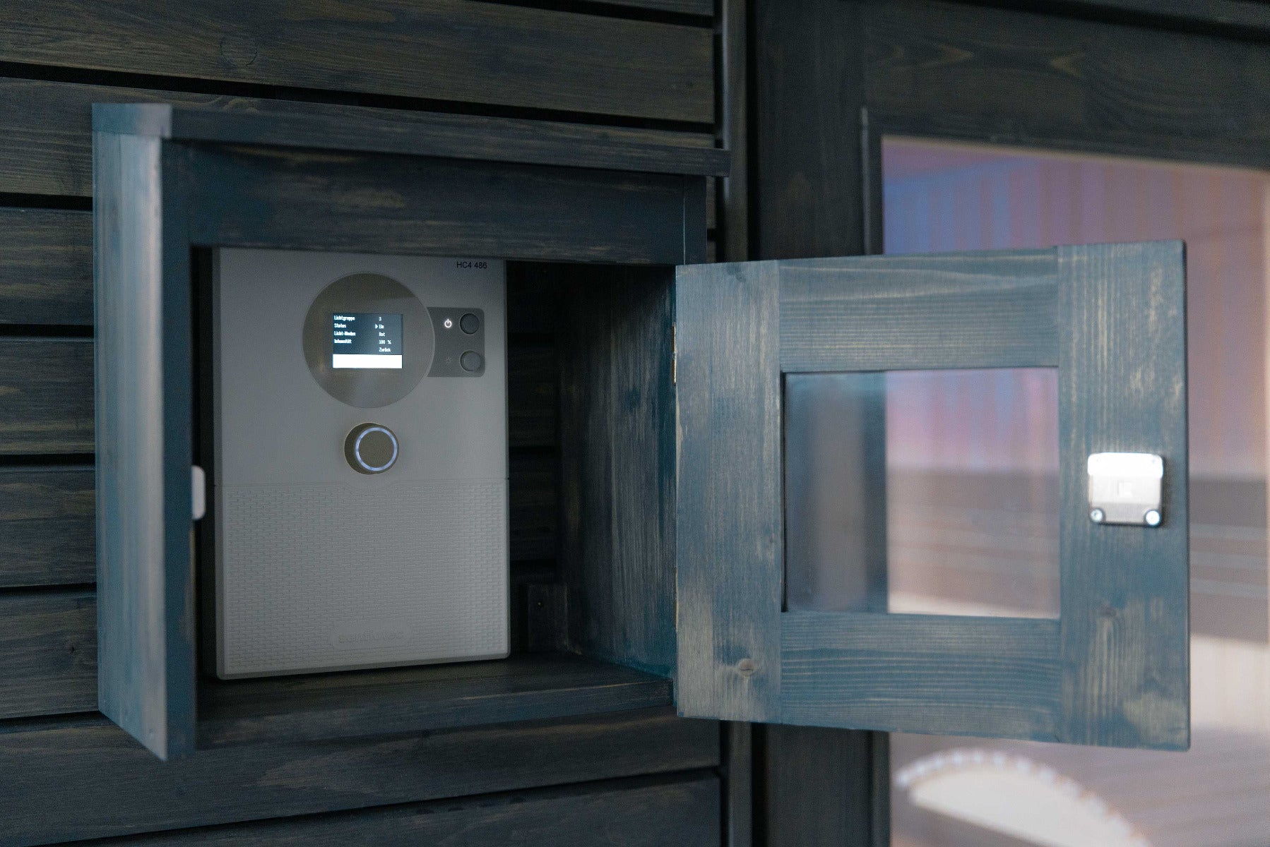 Um ihre Saunasteuerung vor äußeren Einflüssen zu schützen, gibt es den zeitlosen Schutzkasten aus Fichtenholz von Sentiotec.