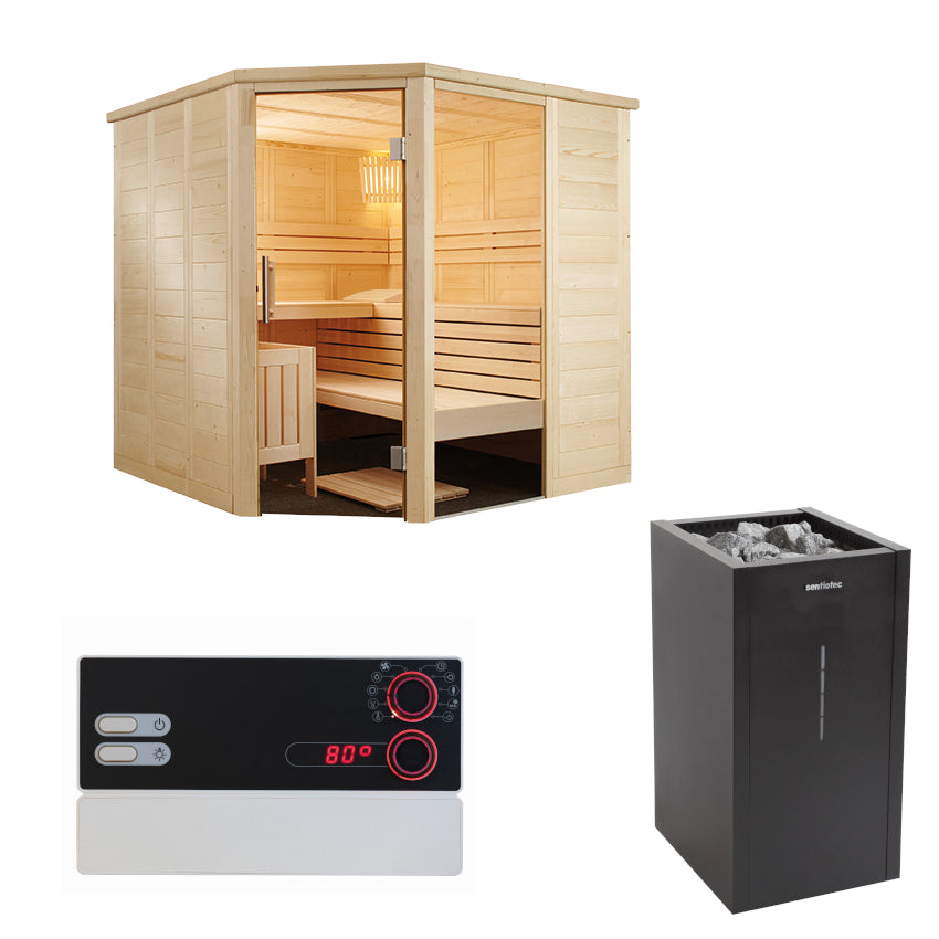 Sentiotec Sauna Set Alaska Corner mit Saunaofen Home Premium Combi 9 kW und Steuerung Pro C3