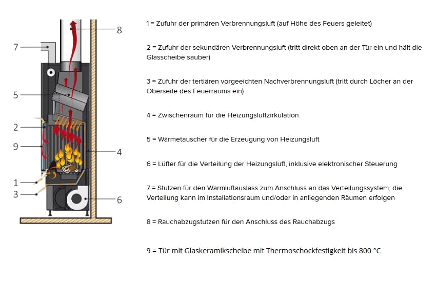 Im Zwischenraum zwischen Feuerraum und Verkleidung zirkuliert von außen zugeführte Luft, die durch die Basis eintritt, sich beim Kontakt mit den Wänden erwärmt und in den Wohnraum austritt.