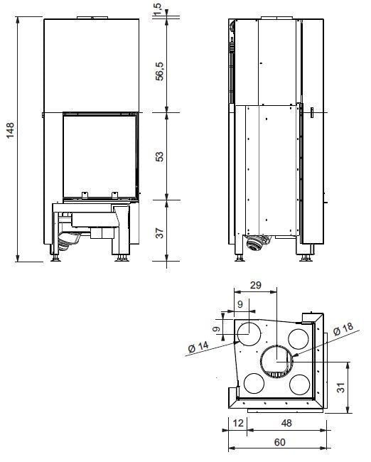 Verbrennungsluft: Primärluft, Sekundärluft und Turbo Luft (Luft unter der Brennkammer um die Zündung des Holzes zu beschleunigen)