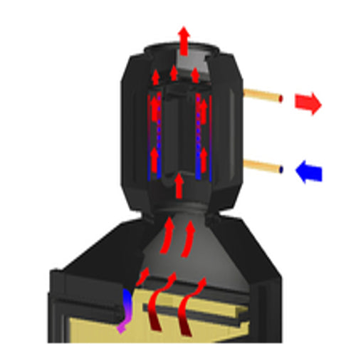 Ähnlich wie wasserummantelte Brennzellen funktionieren auch unsere Aquaboxen. Den aufsteigenden Rauchgasen wird in einem aufgesetzten Wasserwärmetauscher Wärme entzogen und dem Pufferspeicher zur Entlastung der Heizungsanlage zugeführt.