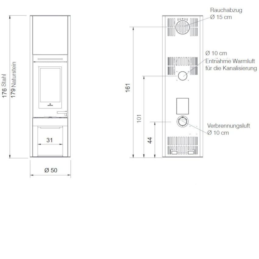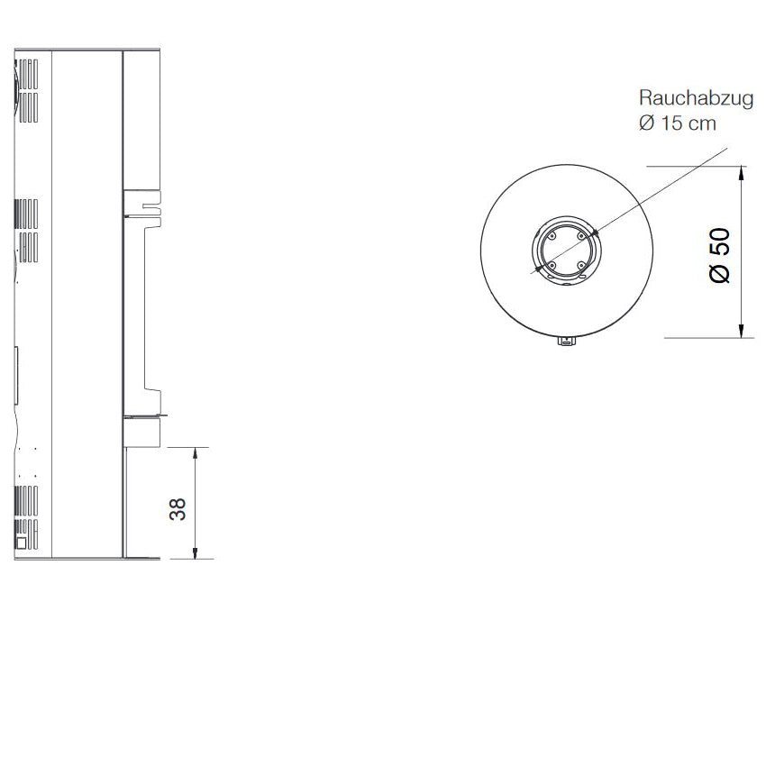 Das Rauchrohr des Tally lässt sich an der Oberseite bzw. an der Rückseite anschließen. Auf Wunsch kann die Wärme des Tally 8 S in einen angrenzenden Raum geleitet werden. Das geschieht mit einem Ventilator, der per Fernbedienung gesteuert wird. Dazu in der Konfiguration bitte das Air Diffuser Kit auswählen.