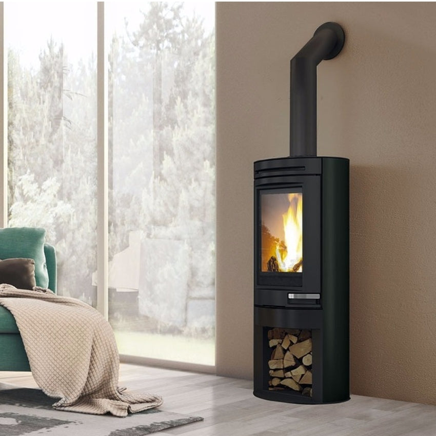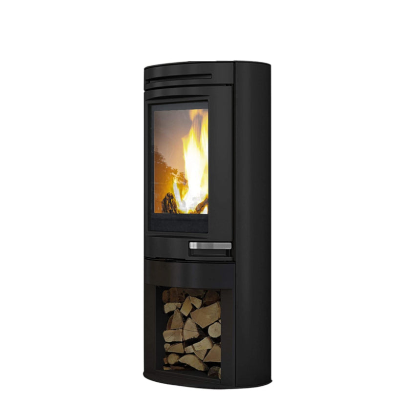 Praktischerweise befindet sich im Sockel ein Holzlagerfach, somit ist das Holz immer griffbereit, wenn es benötigt wird. Das Rauchrohr des Tally 8 lässt sich an der Oberseite bzw. an der Rückseite anschließen. Zudem ist er mit seinen 8,0 kW in der Lage Räume bis zu 210 m³ zu beheizen. Auf Wunsch kann die Wärme in einen angrenzenden Raum geleitet werden. Das geschieht mit einem Ventilator, der per Fernbedienung gesteuert wird. Dazu in der Konfiguration bitte das Air Diffuser Kit auswählen.