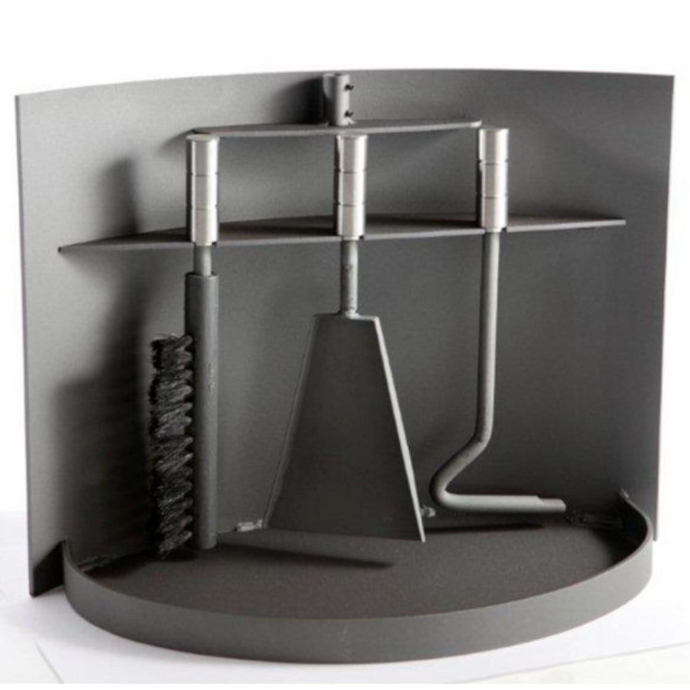 Das handliche Kaminbesteck, bestehend aus Besen, Schaufel und Feuerhaken, kann in der optionalen Holzfachtür der Kaminöfen TT20, TT21, TT23, TT30 und TT80 sicher und unsichtbar verstaut werden.