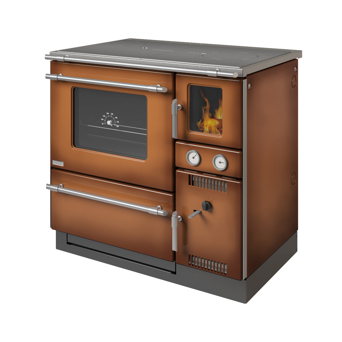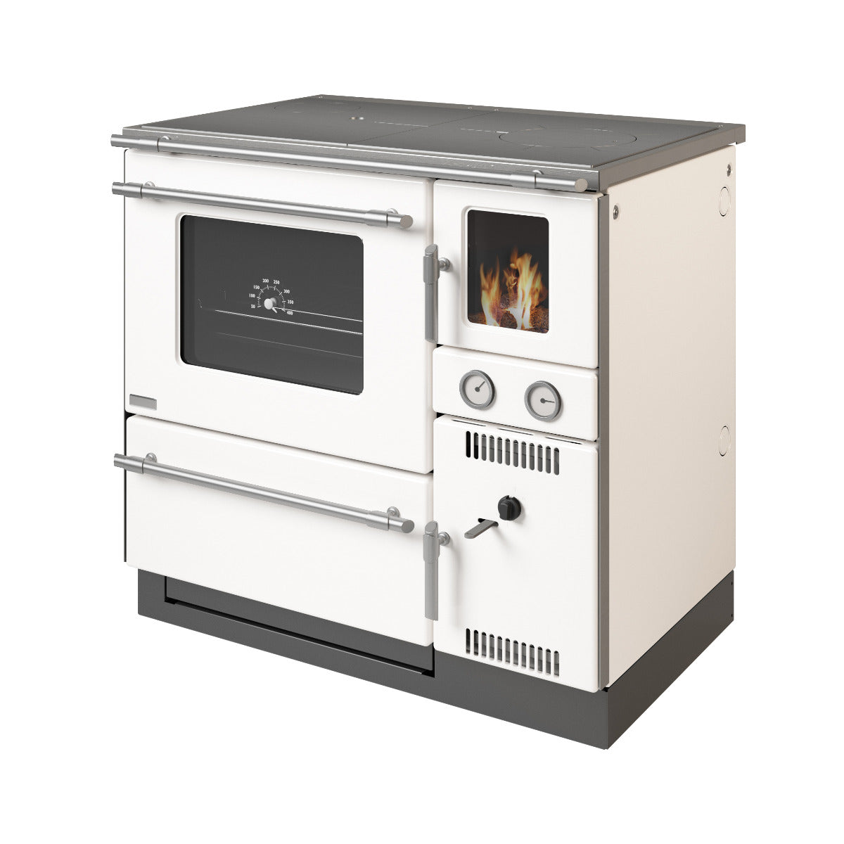 Die serienmäßige Ausstattung lässt sich auch sehen. Eine thermische Ablaufsicherung, Mano- und Thermometer, ein Wärmetauscher und eine Zentraleinrichtung mit Abgasumlenk- und Anheizklappe. Die Verkleidung aus Rein-Emaille, der massive Edelstahlrahmen und der Vintagelook runden das Gesamtpaket K 148 F ordentlich ab. Zusätzlich verfügt der K 148 F über ein Sichtfenster, durch das Sie das wohlig warme Feuer im Inneren beobachten können. So ist der Küchenofen nicht nur ein richtiger Alleskönner, sondern auch noch für romantische Abende zu haben.