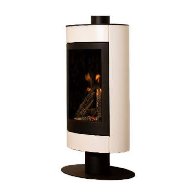 Ansprechender Gaskamin TALI F mit abgerundeten Seiten | Stahlmantel in Weiß | schwarzer Fuß | Frontscheibe | 6 kW Leistung