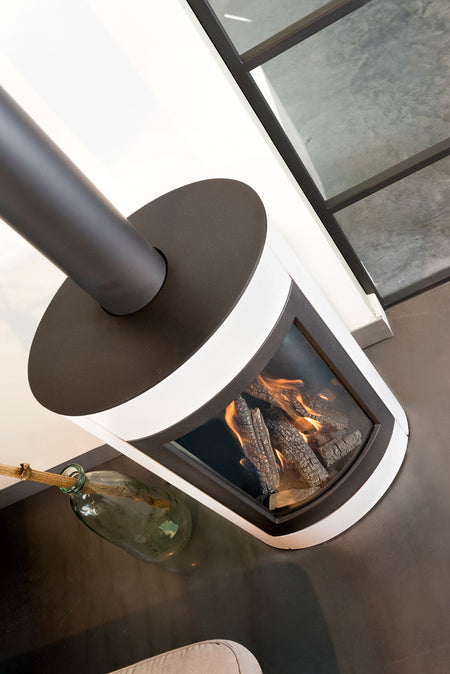 Ansprechender Gaskamin TALI mit abgerundeten Seiten | Stahlmantel in Weiß | einfache Frontscheibe | 6 kW Leistung