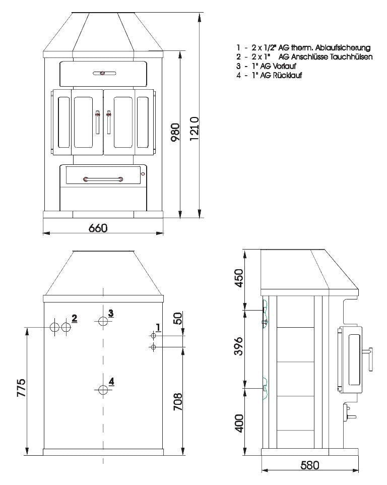 Der Wasser Kaminofen 2AKBS mit Haube ist entwickelt für die Einbindung in ein Warmwasserheizungssystem. Der 2AKBS Ofen hat einen eingebauten Sicherheitswärmetauscher für die Übertemperaturabsicherung.